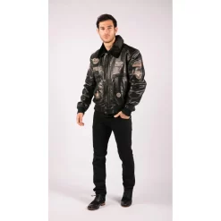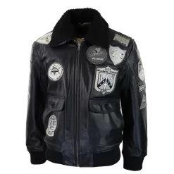 Men’s Black Leather Bomber Aviator Badge Pilot Jacket Removable Fur Collar