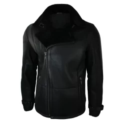 Men’s Winter Sheepskin Black Mid Length Fitted Jacket Cross Zip