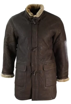 Mens Winter Real Sheepskin Leather Duffle Safari Jacket Brown & Cream Hood Vintage-B3 Brown Ginger
