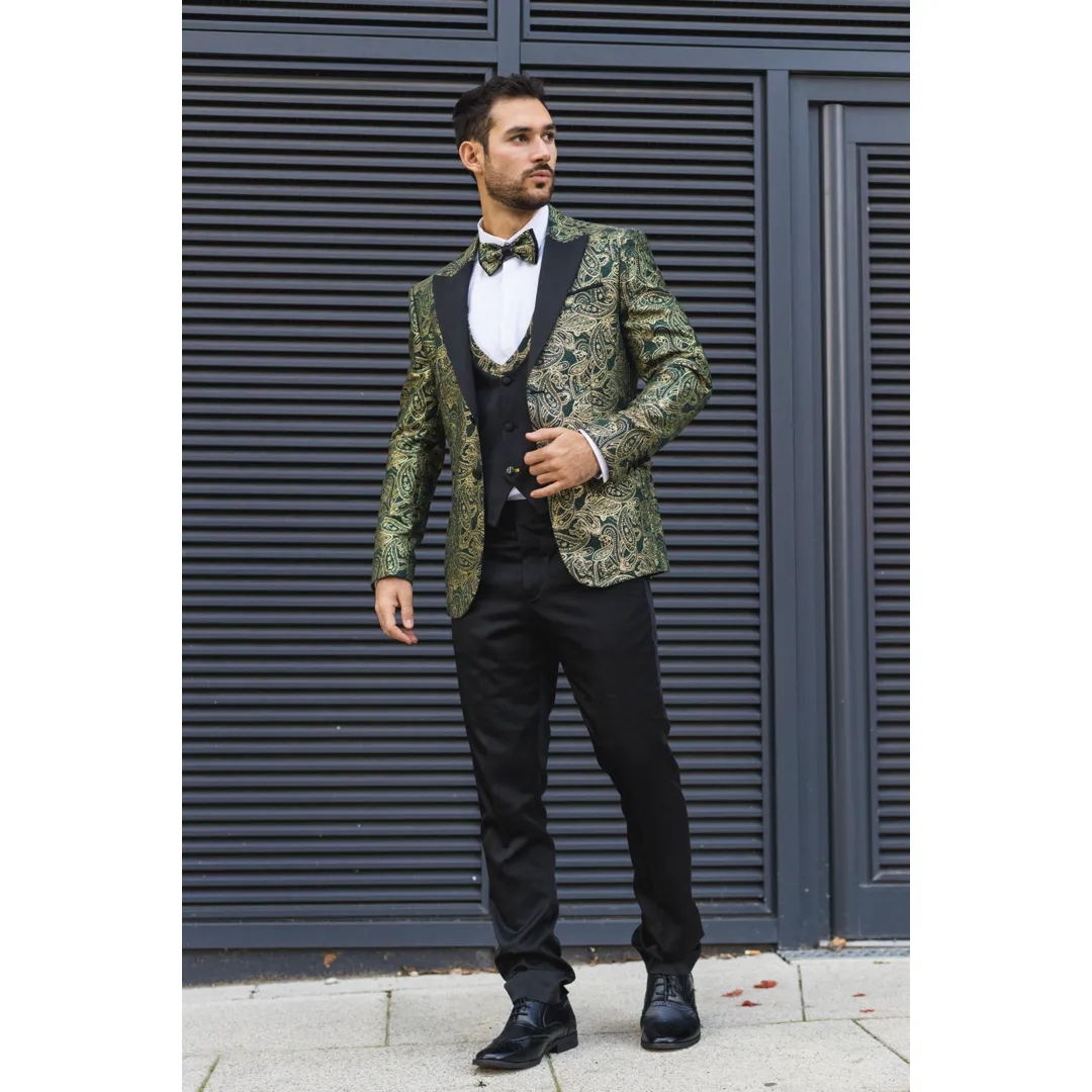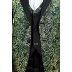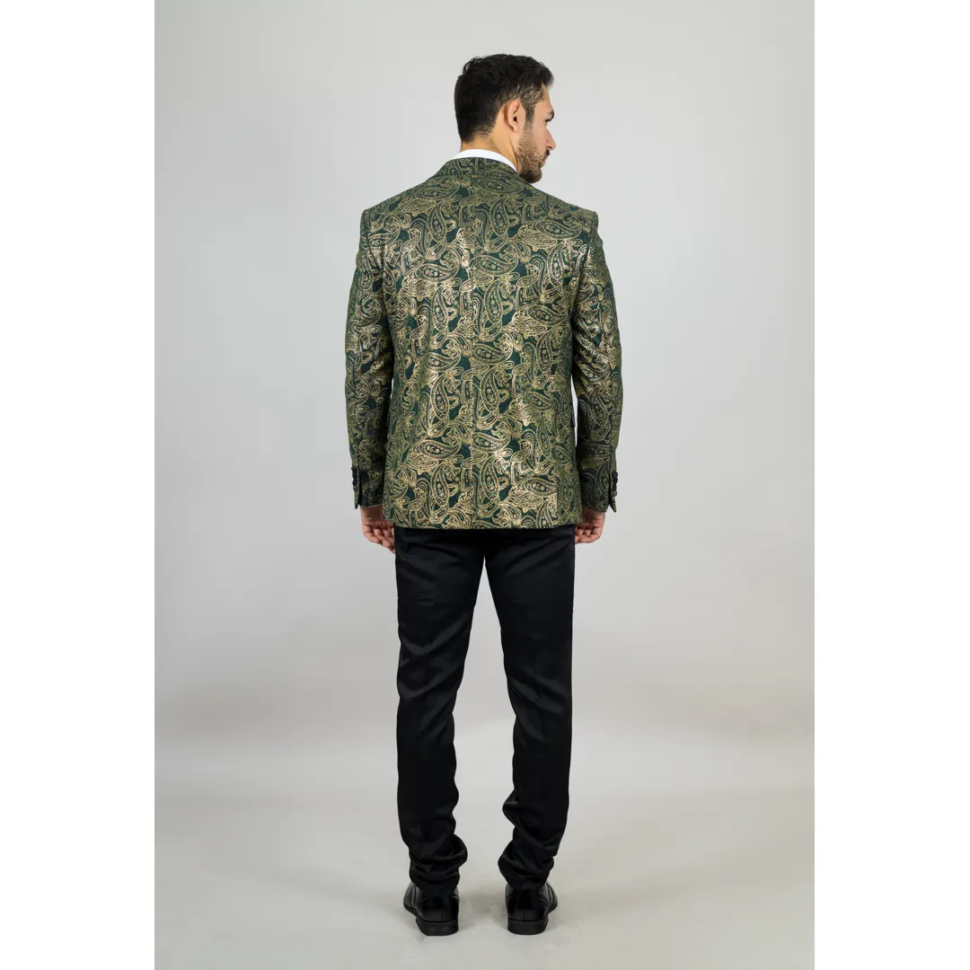 * Green Blazer with Gold Paisley Details: The tailored-fit blazer features an elegant green fabric with intricate gold paisley detailing, adding a touch of sophistication to any formal occasion