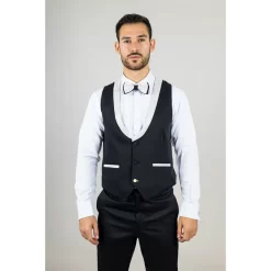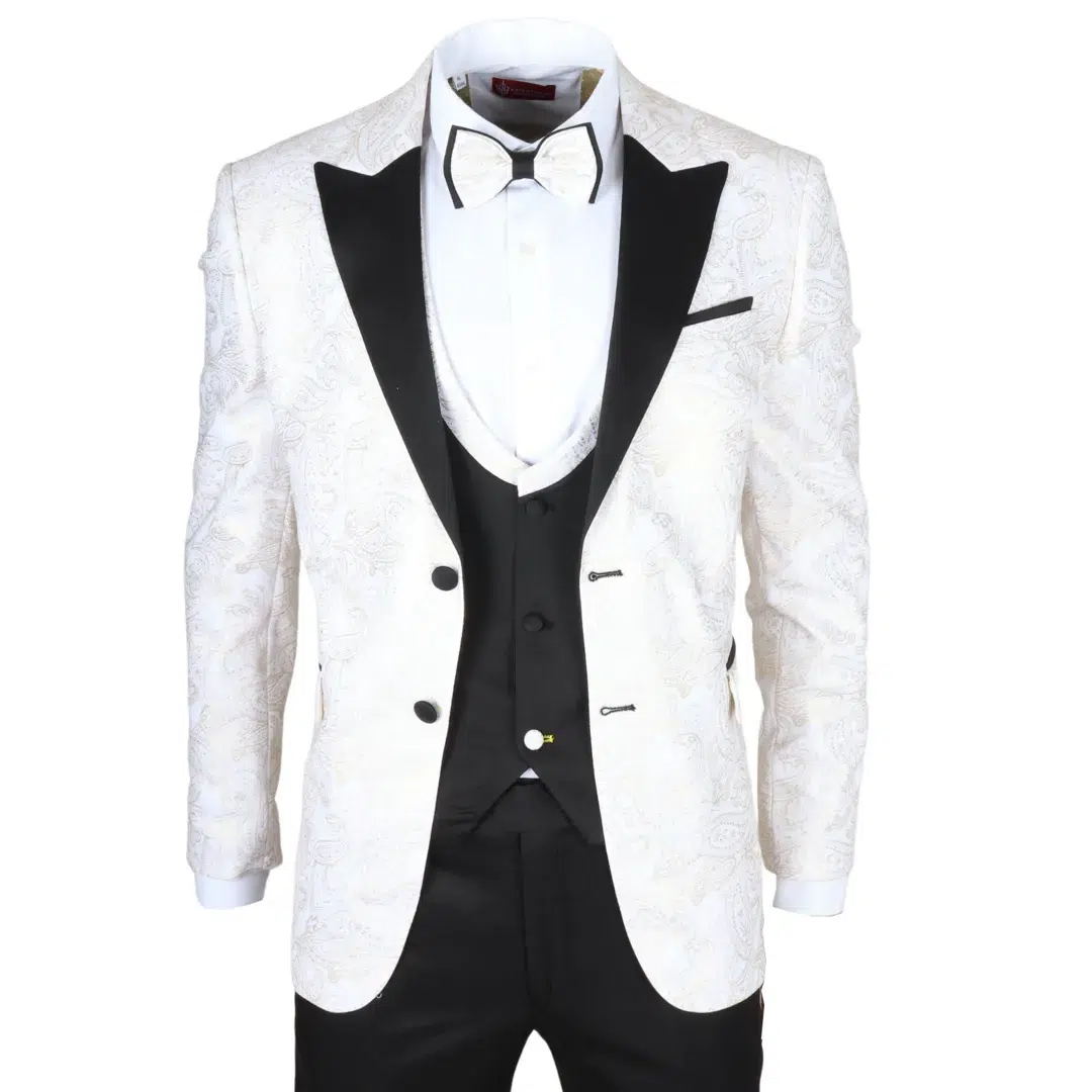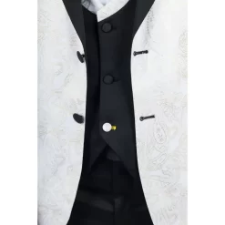 * 3-Piece Set: Includes a white blazer with gold paisley detailing, a black waistcoat with gold paisley accent trim, matching black trousers, and a complimentary bowtie for a complete, polished look