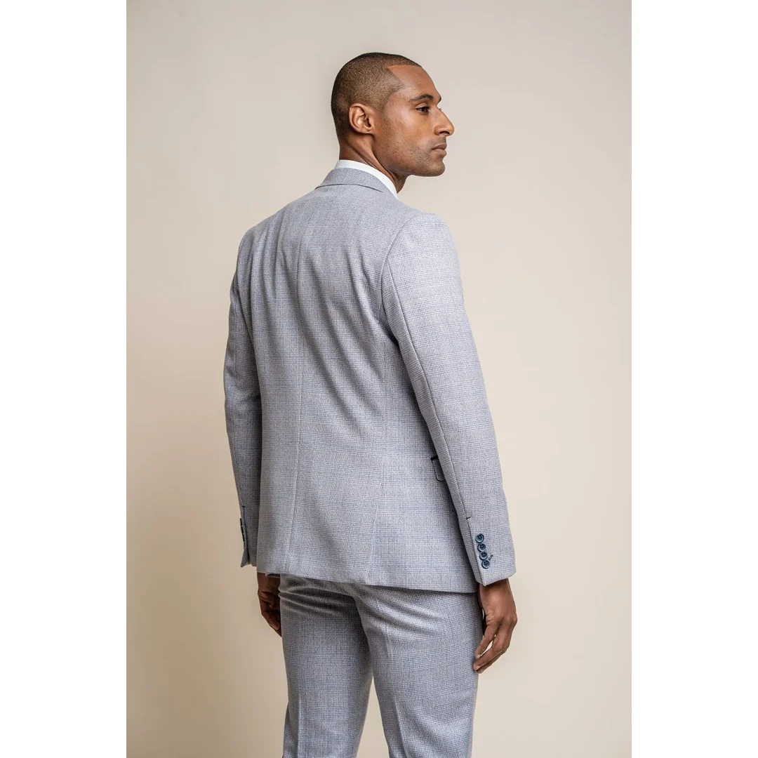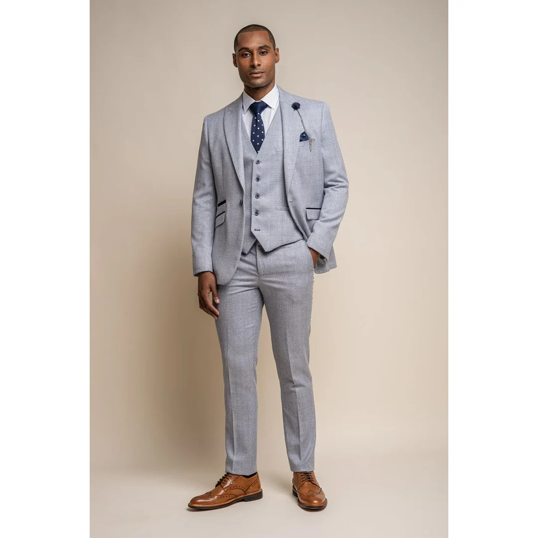 * Light Blue Elegance: The Caridi light blue blazer for men exudes sophistication with its tastefully designed tweed fabric, offering a touch of refined elegance.