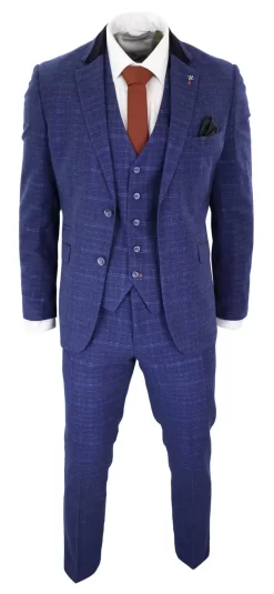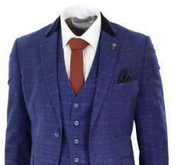 Mens Blue Tweed Check 3 Piece Suit Vintage Retro Classic Tailored Fit 1920’s