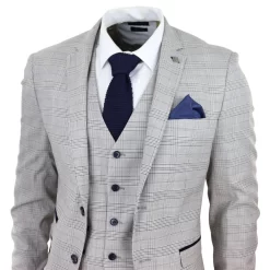 * Navy velvet trims: Adding a touch of elegance, the suit has navy velvet trims along the pockets providing a luxurious contrast to the grey fabric.