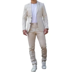 * Beige color: This suit is a classic beige color that is perfect for any occasion. The color is versatile enough to be worn to the office, a wedding, or a casual event.