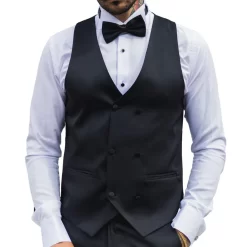 * Elegant Design: The black satin double-breasted waistcoat features a sophisticated and timeless design, making it a perfect complement to a black tie dinner suit.