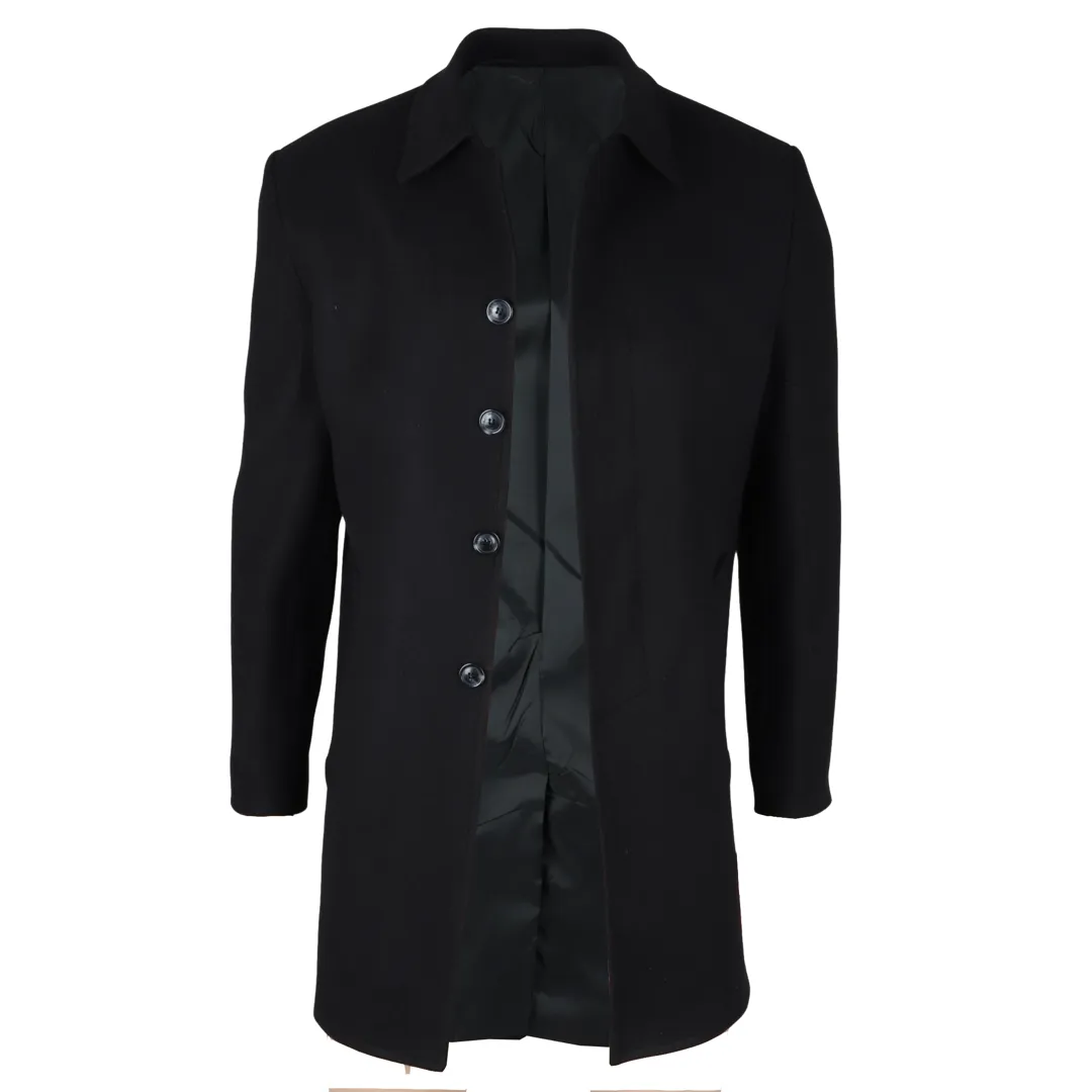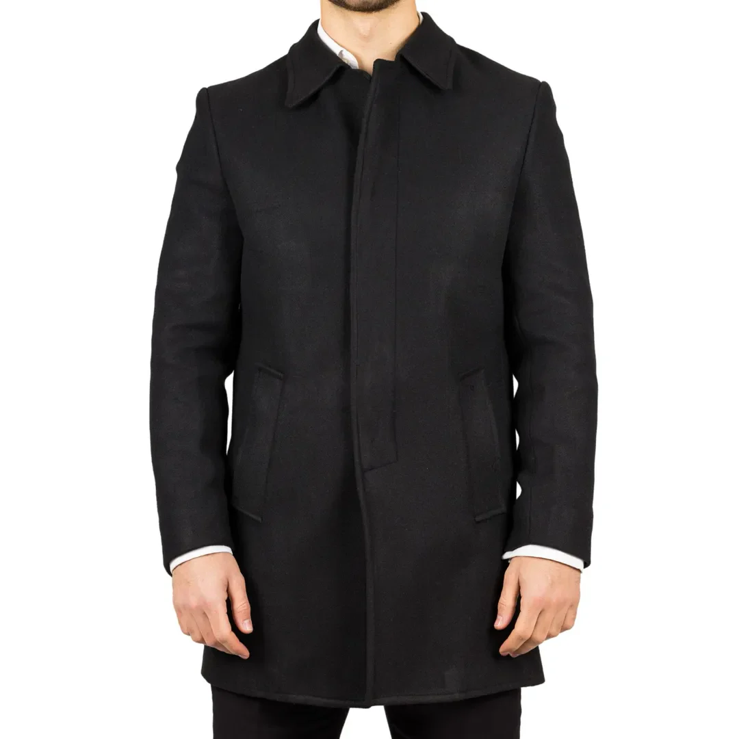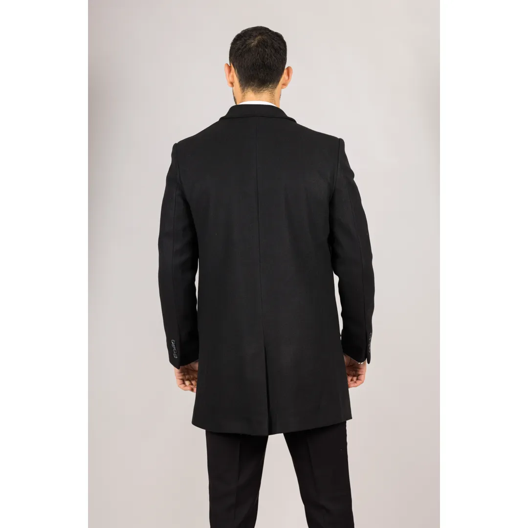 * Wool Blend Fabric: Crafted from a high-quality wool blend, this black overcoat offers warmth and comfort during the colder months