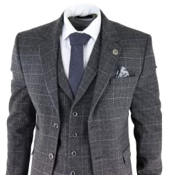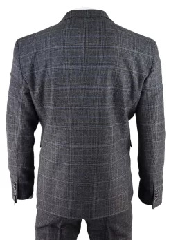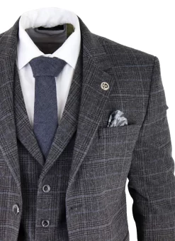 Men’s Grey Tweed 3 Piece Suit Blue Check Vintage 1920s Gatsby Blinders Tailored Fit