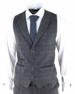 - Tweed Grey Prince Of Wales Blue Check Suit Finished In Wool Feel Premium Soft Fabric With a Turn-Down Collar Waistcoat