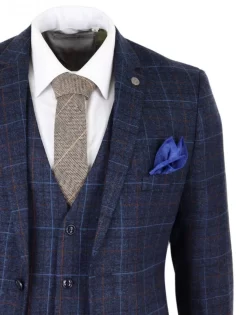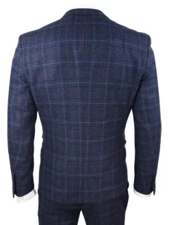 Mens Navy Blue Tweed Check 3 Piece Suit Double Breasted Waistcoat Peaky Blinders Vintage