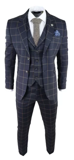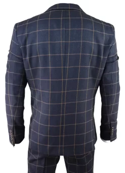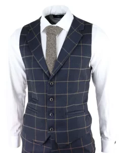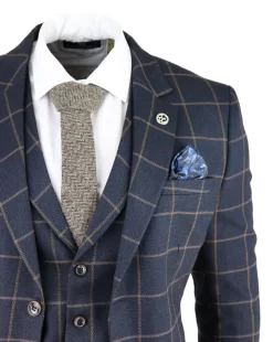 Men’s Blue 3 Piece Suit Tan Check Classic Wedding Prom Peaky Tweed Vintage