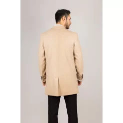* Notched Lapel Collar: The beige overcoat includes a stylish notched lapel collar, adding a sophisticated and professional touch to the overall look