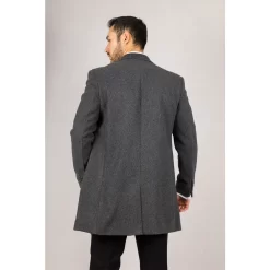* Notched Lapel Collar: The grey overcoat includes a stylish notched lapel collar, adding a sophisticated and professional touch to the overall look