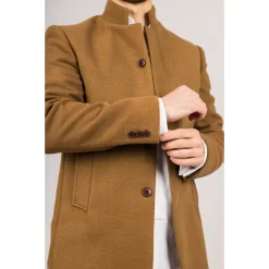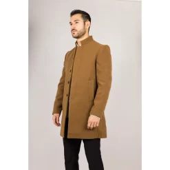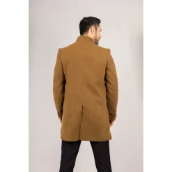* Wool Blend Fabric: Crafted from a high-quality wool blend, this tan overcoat provides warmth and durability, ideal for maintaining comfort in colder seasons