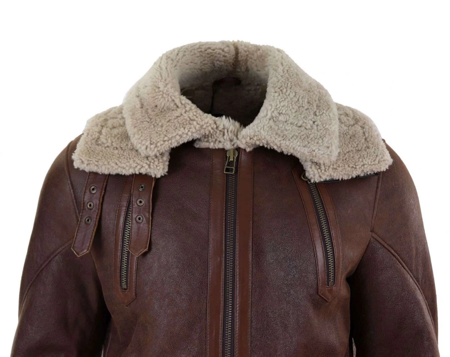Mens Real 3/4 Shearling Sheepskin Jacket Brown Beige Long Belt Flying Cockpit