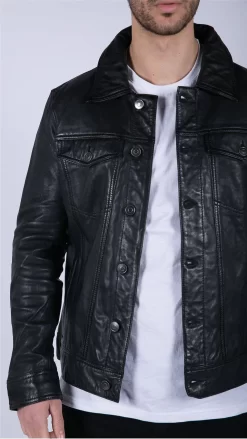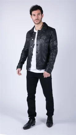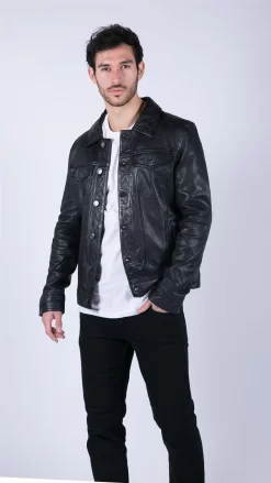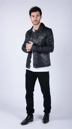 Menβs Genuine Leather Jeans Jacket In Classic Black Soft Sheep Napa Leather