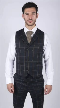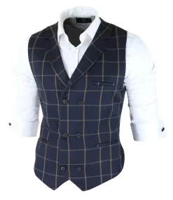* Tweed Double Breasted Check Waistcoat Finished In Navy With Contrasting Brown Check Detailing