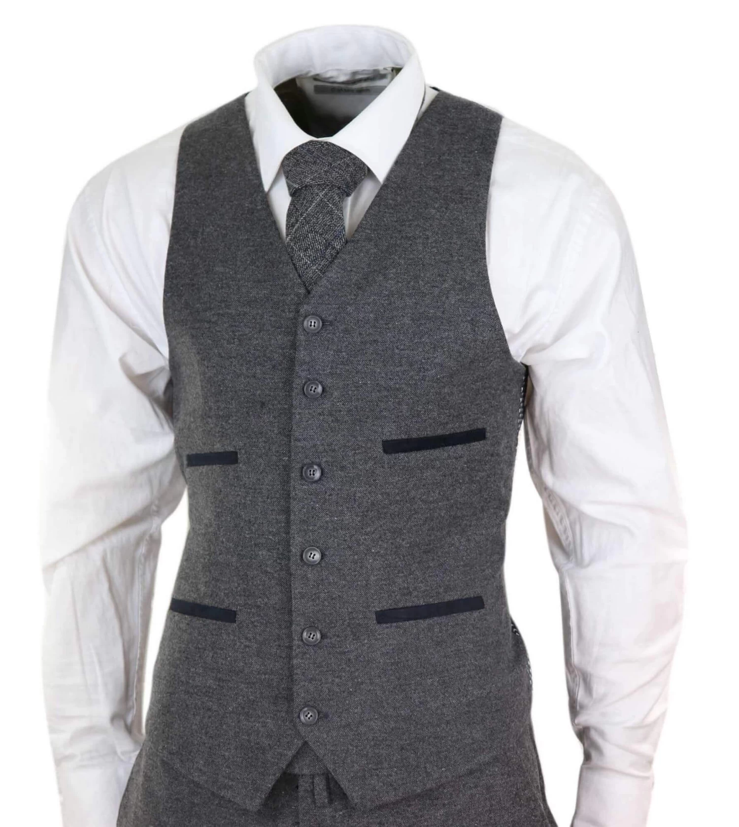 * Premium Wool Tweed Fabric, 4 Pocket Waistcoat Design With Contrasting Trim & Detailaing