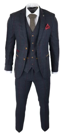 * Navy Blue Herringbone Tweed With Red Window Check Detailing, True 1920s Vintage Fashion With A Modern Twist