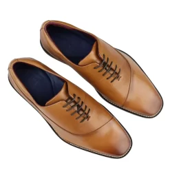 * High-Quality Materials: These tan brown menโs laced real leather derby shoes are crafted from genuine leather, ensuring durability and a sophisticated appearance. The premium leather provides a luxurious feel and enhances the overall quality of the shoes.
