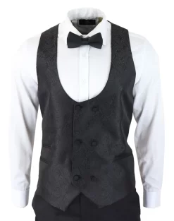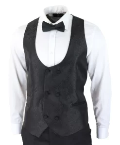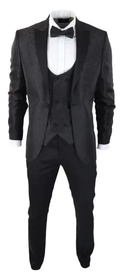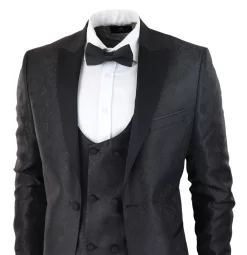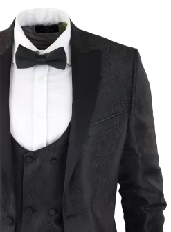 * Finished In Black Paisley Floral Stitched Pattern With Contrasting Black Satin Peak Lapels & Matching Satin Buttons