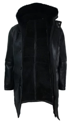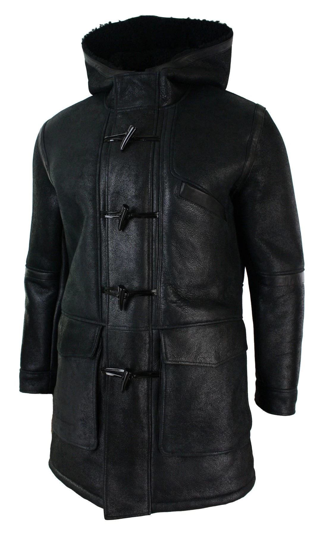 Mens Real Shearling Sheepskin 3/4 Hood Duffle Jacket Black Fur Warm Winter