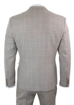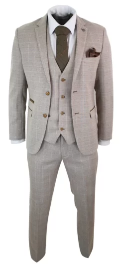 Menβs Check Tweed Beige Brown 3 Piece Suit Wedding Prom Vintage Retro Classic