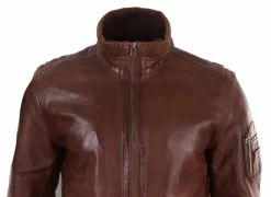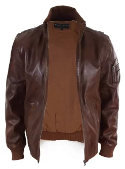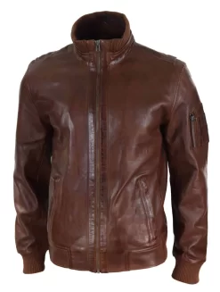Menβs Real Leather Bomber Jacket Smart Casual Blue Brown High Elasticated Neck