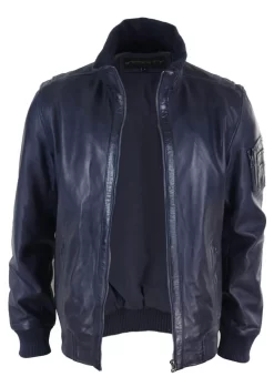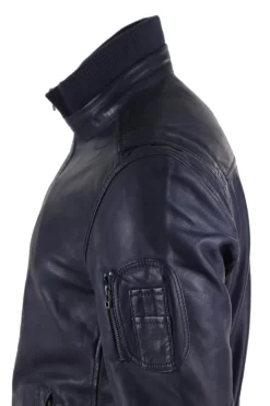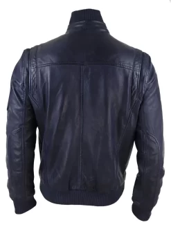Men’s Real Leather Bomber Jacket Smart Casual Blue Brown High Elasticated Neck