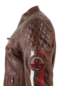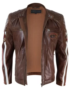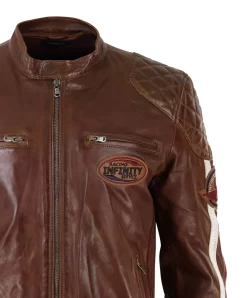Menβs Timber Brown Real Leather Racing Jacket Stripe Sleeves Moto Biker