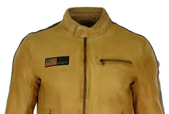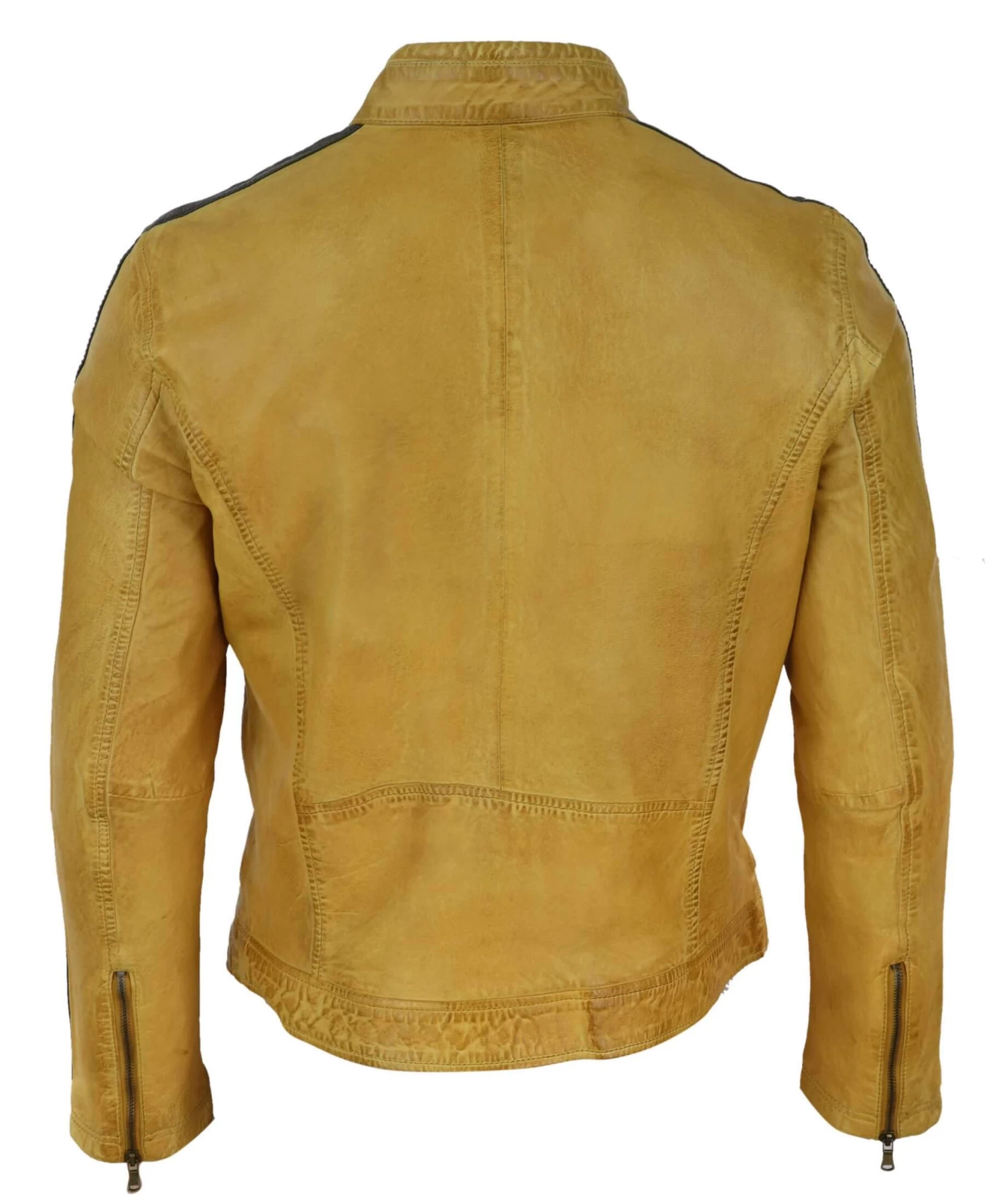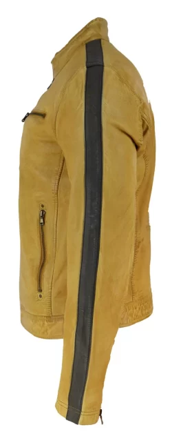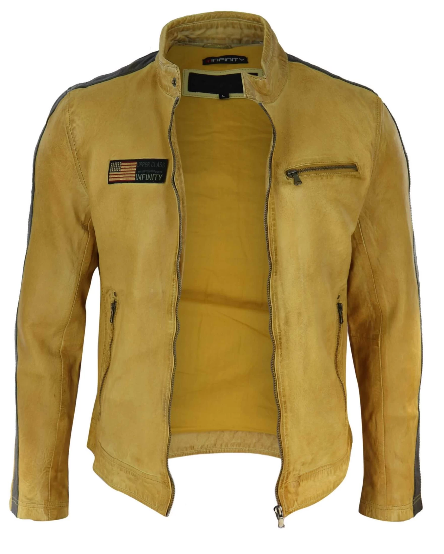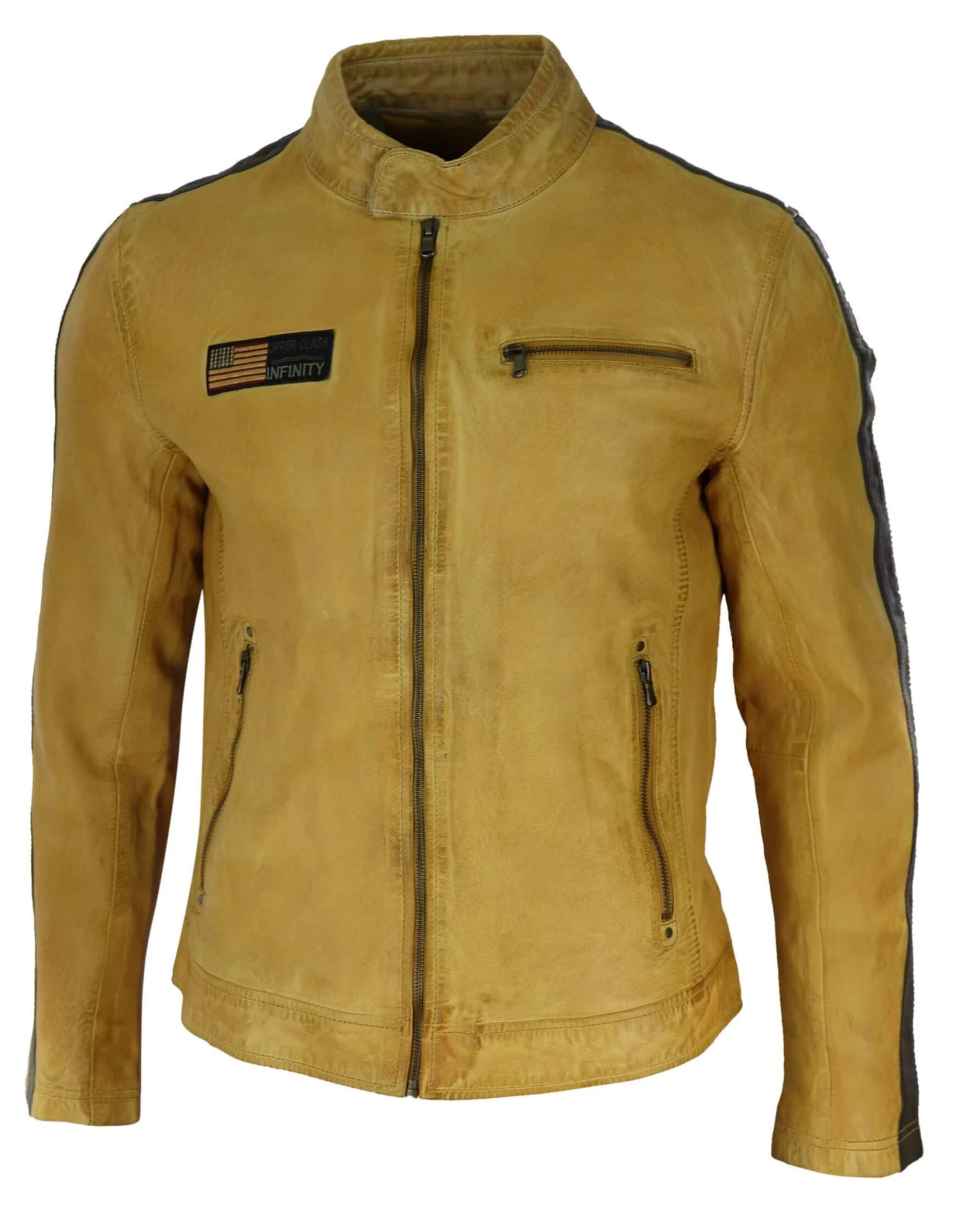 Menโs Real Leather Biker Racing Jacket Stripes Zip Retro Casual Yellow Short